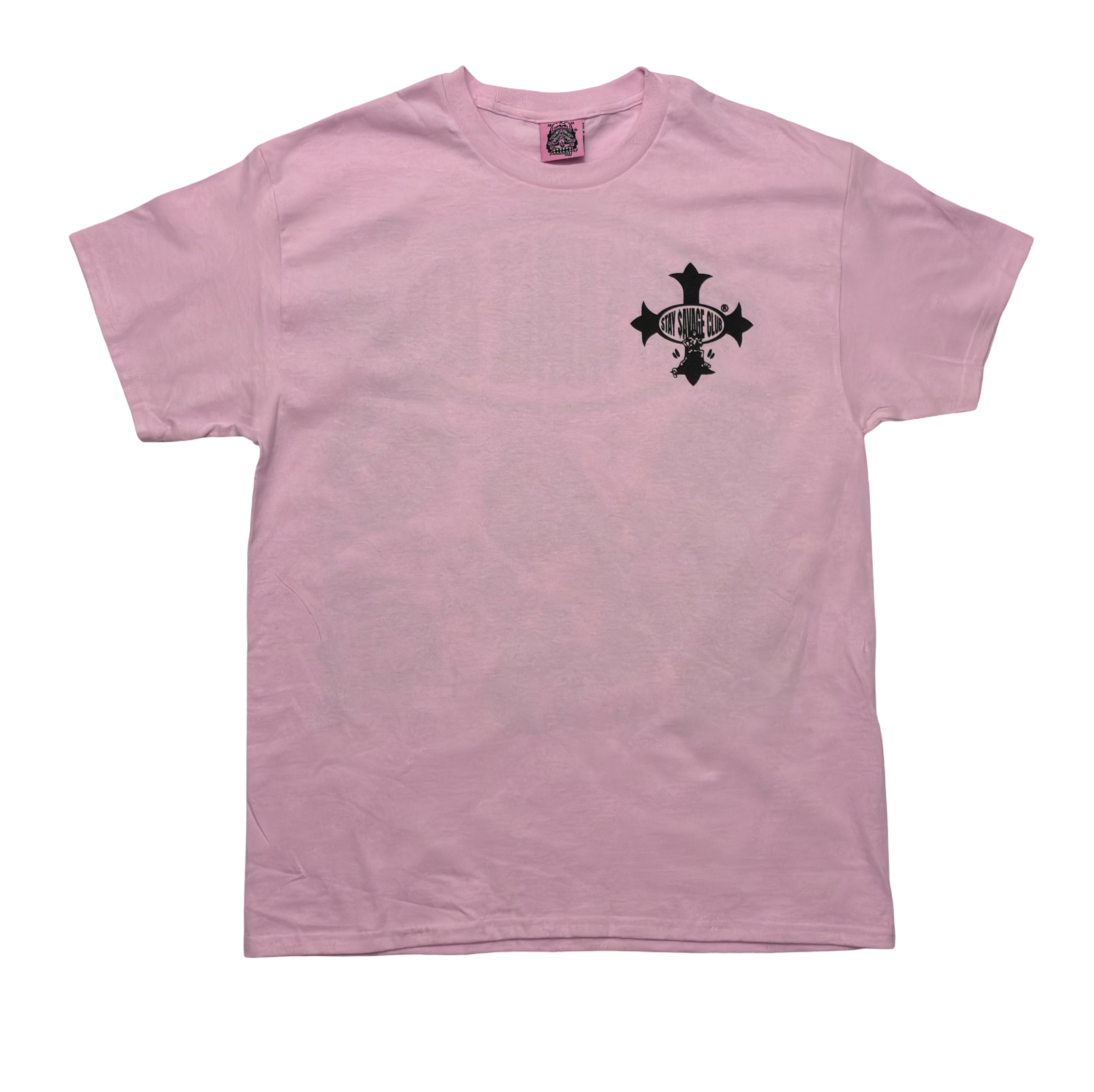 This design features a collection of original drawn characters, NYC $AVAGE©, MIKEY $AVAGE©, SAM $AVAGE©, $AVAGE BULL©, THE $AVAGE FLAG©, BOOM BOMB $AVAGE©, THE $AVAGE SEVENS©, $AVAGE RUNNER, $AVAGE HEART©, $AVAGE DOLLAR$™ and THE $AVAGE CAT© with the STAY $AVAGE CLUB® oval logo and cro$$es. The front of the tee features a 4.25" left chest print image.