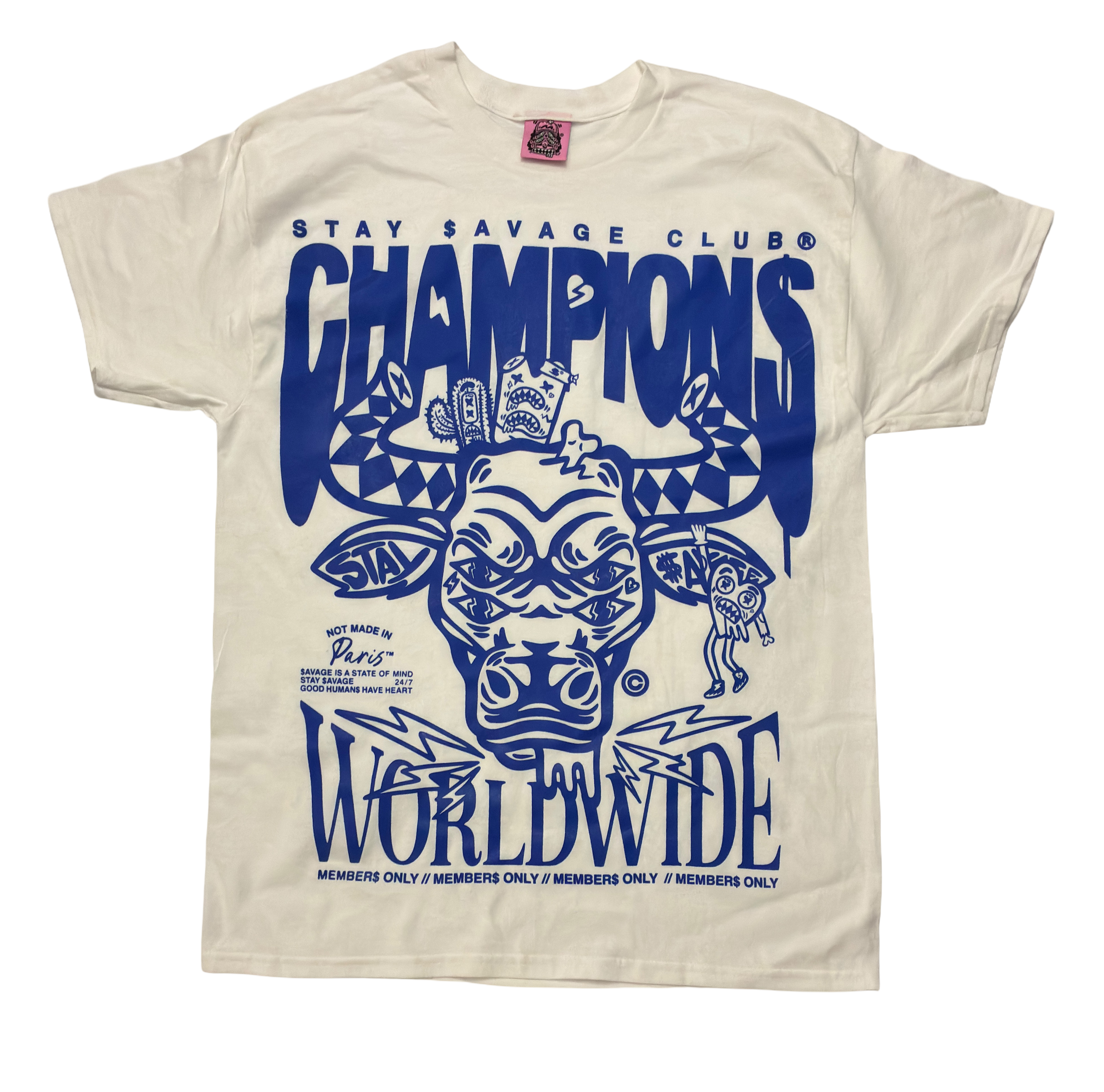 This design features an original drawn character named $AVAGE BULL© , silkscreened by hand with light royal blue ink on a white classic fit tee made of 100% preshrunk cotton at approximately 5.3oz.